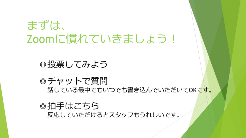 まずは、Zoomに慣れていただくために、Zoomの機能を活用したコミュニケーションの時間を設けました。
