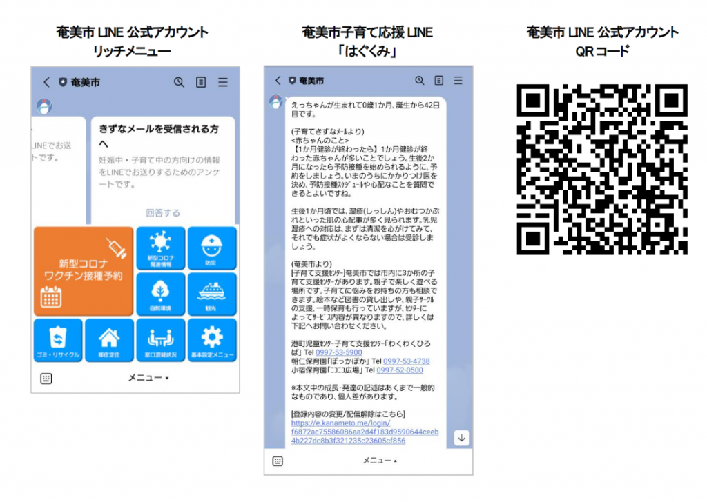 奄美市が2021年4月9日に開始した「奄美市LINE公式アカウント」(アカウント名:奄美市)では、KANAMETOを導入して、新型コロナウイルスに関する情報などを配信してきました。そして、新たに2021年6月1日より、同市LINE公式アカウントにおいて、奄美市子育て応援LINE「はぐくみ」のメッセージ配信を開始しました。