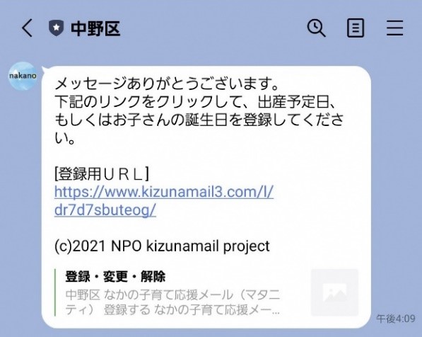 NPO法人きずなメール・プロジェクト(本社:東京都新宿区、代表理事:大島由起雄)は、2021年8月1日より、東京都中野区(区長:酒井直人)が「中野区LINE公式アカウント」より配信を開始する「なかの子育て応援メール」へ、LINE配信用メッセージの提供を開始しました。