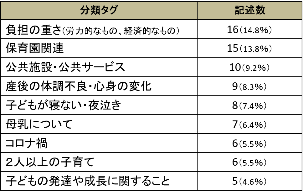 子育て期では「頻繫にある」「時々ある」を合わせると33.7%で、その 「頻繁にある」「時々ある」という方は、それはどんな時ですか? の質問に対する自由記述が下です。ひとり育児やコロナ禍での子育てで感じる孤独感、頼れる人がいないと感じる際に孤独感を感じるとの回答が上位を占めています。ちなみに、この自治体の妊娠期でも同じ質問をしており、妊娠期では、「頻繫にある」「時々ある」を合わせると19.4%でした。他の自治体でもそうでしたが、子育て期の方が孤独感を感じる割合が高くなっています。