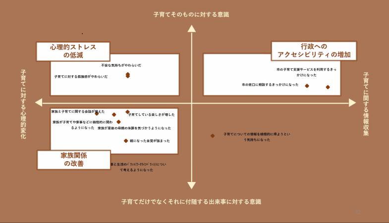 今年からは「広聴チーム」が発足し、団体として新しい取り組みを2つ行いました。1つ目は、読者アンケートのリニューアル。これまでは事業評価のみのアンケートでしたが、2021年度からは読者の子育ての心境や心理的状況を聞くための設問を追加しました。2つ目が、読者アンケートを実施して承諾があった22自治体のデータを統合した「統合データ」の作成。これにより、きずなメールを受け取った読者の気持ちや行動変容を統計学的な方法でも理解し、一層の読者理解に努めました。