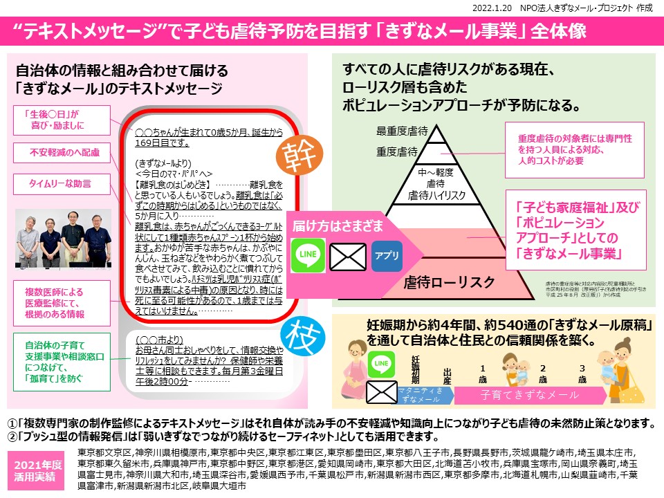 複数専門家によって制作監修されたテキストメッセージは、それ自体が読み手の不安軽減や知識向上につながり、こども虐待の未然防止策として機能します。