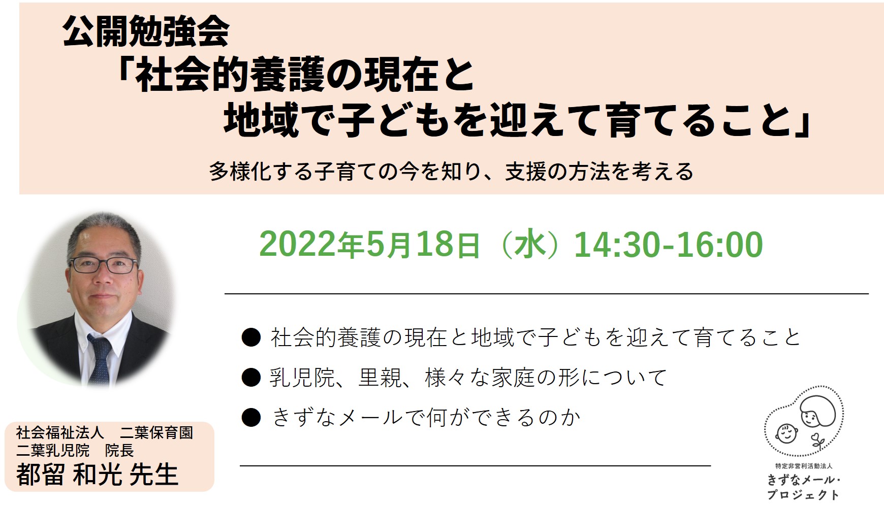 これを踏まえ、多様化する子育て家庭を知ることが団体にとって重要と考え、今回はスタッフ2名が以前勤務していたご縁もあり、社会福祉法人二葉保育園二葉乳児院院長の都留和光氏を招いて、「社会的養護の現在と地域で子どもを迎えて育てること」についてお話いただく勉強会を開催します。