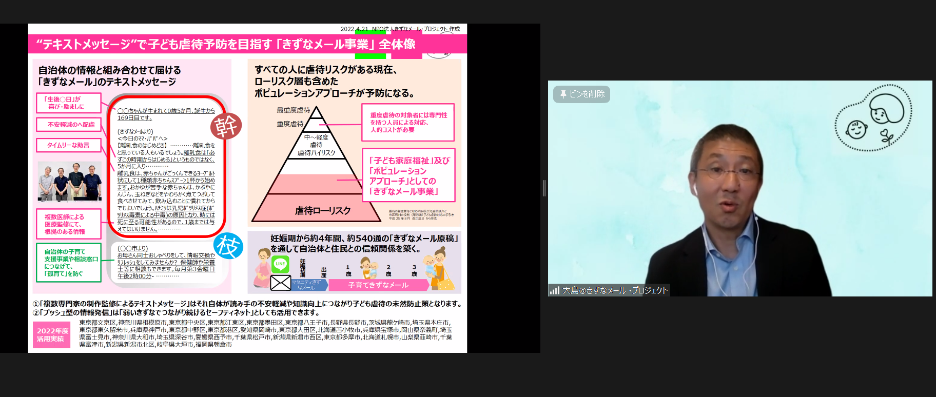 妊娠期・子育て期の家庭に、その時期に必要な知識・情報を届けながら、ゆるやかにつながり続けることができる『きずなメール』が、乳幼児虐待予防の大きな可能性を秘めていることを認識していただき、活用の可能性を広げられるよう、今後も考え続けていきたいと思っています。