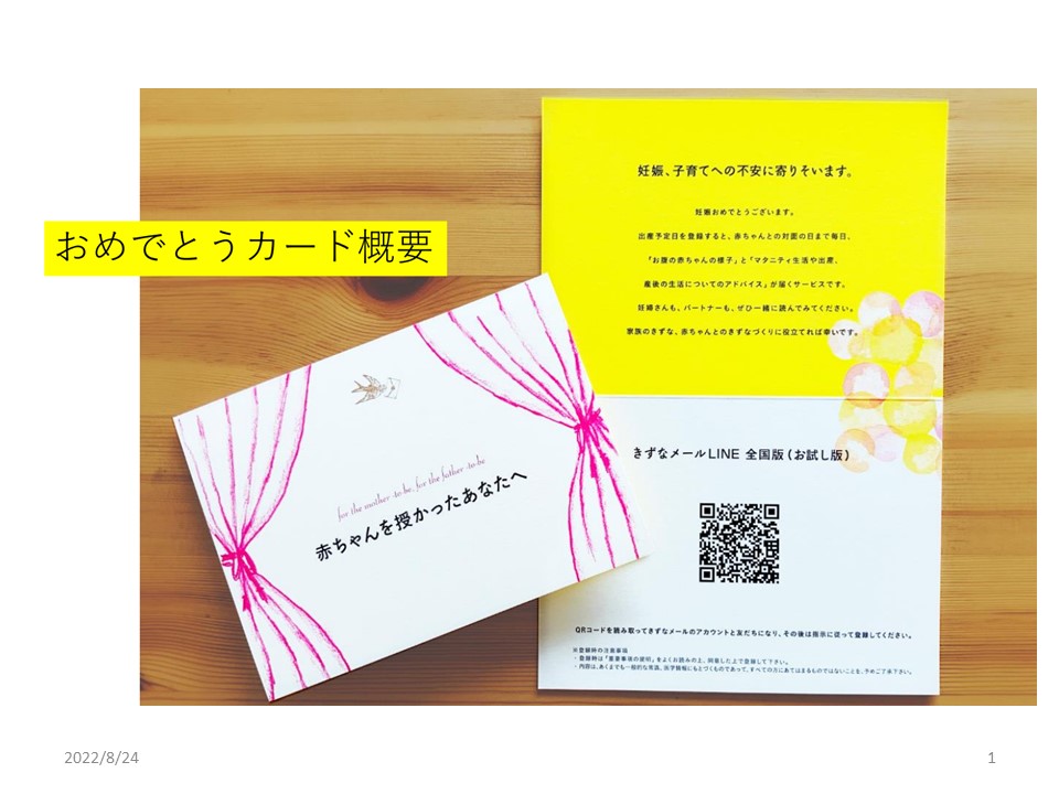 妊婦さんが安心して妊娠期を過ごしてもらえるように、「あなたの妊娠、出産を私たちもサポートします」、というメッセージを伝えながらおめでとうカードを渡していただいています。デザインはもう1パターンあり、どちらも文言はオリジナルで作成することができます。