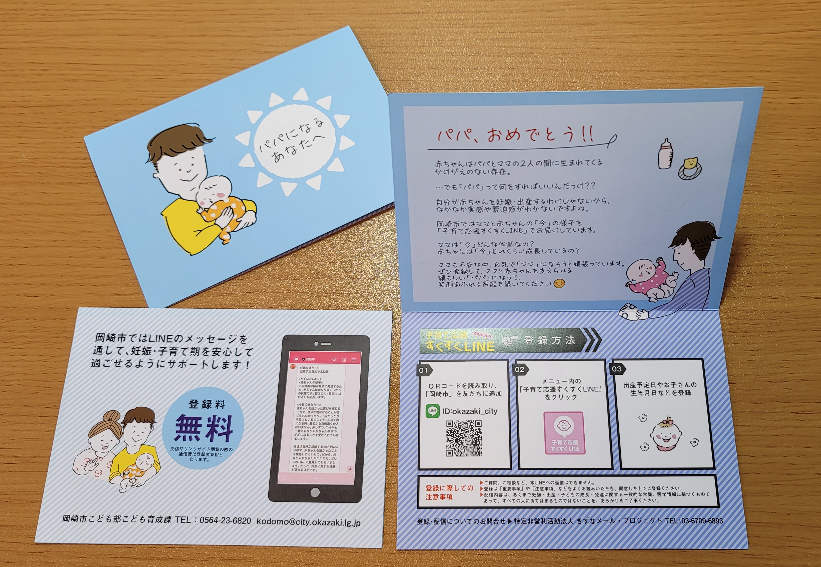 母子手帳交付時等に、保健師さんや窓口担当者から登録案内として配布していたカードです。パートナーが参加していればその場で。いない場合も、持ち帰って渡してもらえるよう配布していました。