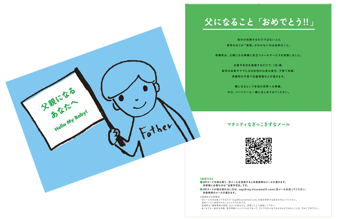 「きずなメール事業」を展開している自治体では、「きずなメール」をベースに作ったテキストメッセージを、子育てに関わるご家族全員で読むことを推奨しています。このため、妊産婦さんだけでなく、「パートナーと読むため」や「パパ向け」に登録案内ができる周知物を活用している自治体もあるので紹介します。