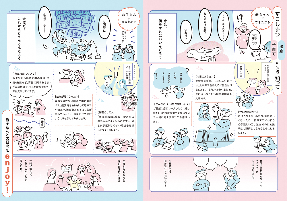区役所に来られた妊産婦さんや乳幼児の子育て中の方、そのご家族に配布。