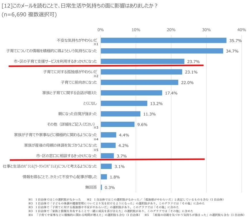 広聴アンケートでは必ず、「このメールを読むことで、日常生活や気持ちの面に影響はありましたか?」という設問を選択式で答えていただいています。相談に関する選択肢は、「区市町村の子育て支援サービスを得るきっかけになった」「市区町村の相談窓口に相談するきっかけになった」の2つがあり、子育て期ではそれぞれ23.7%、3.7%という割合。この数値が高いか低いかは、各自治体の背景や回答者の状況など要因が複雑で慎重に評価すべきところです。