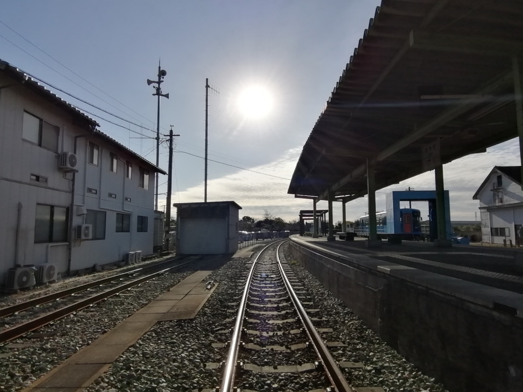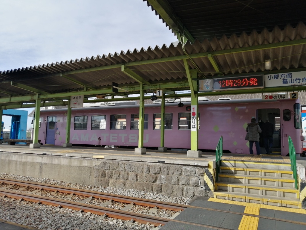 朝倉市役所最寄り駅の甘木駅。ピンクの車体。
