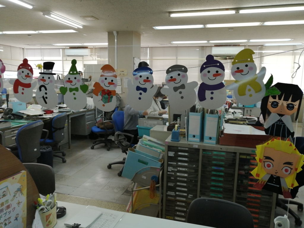 係長の作成された鬼滅の刃の折り紙と、保育士さんが作られた季節感の感じられる作品で、窓口は親しみやすい雰囲気です。
