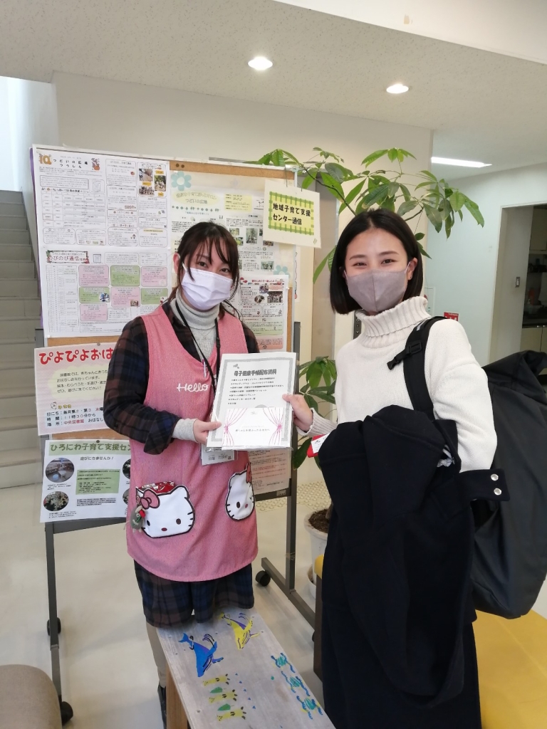 母子手帳交付時にご案内する場所で、現場でご活躍の保健師さんと。