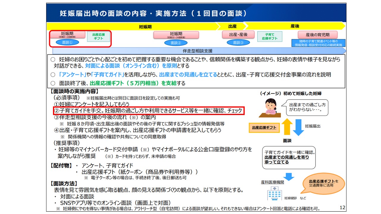 そして、下記の図の通り、妊娠届時の面談時に手交(しゅこう:公式文書を手渡しすること)し、妊娠期の過ごし方や利用できるサービス等を一緒に確認しているとの事です。