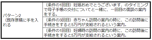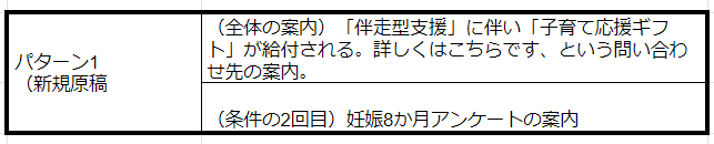 「妊婦時訪問」や「赤ちゃん訪問」の案内の中に、「子育て応援ギフト」のことを盛り込んだ提案も多く見られました。