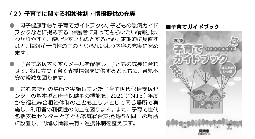 によると、岡崎市では、「第2期岡崎市まち・ひと・しごと創総合戦略」の基本目標に「未来のひとづくり」を掲げており、3世代の同居・近居率のさ、西三河製造業勤務世帯の多さなど、本市の特性を踏まえ、安心して楽しみながら子育てできるまちを目指している。