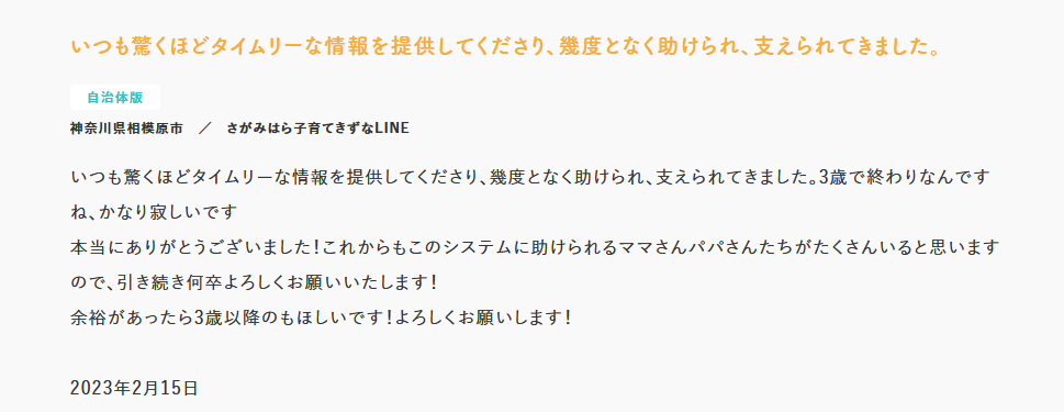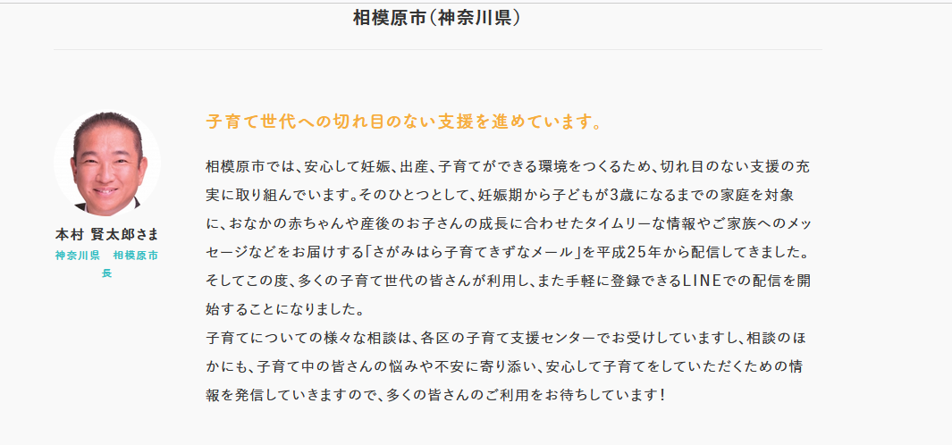 孤育て(孤独な子育て)の不安感・負担感の軽減や産後うつの予防のため、母親・父親など家族へのメッセージ、赤ちゃんのお世話などのアドバイスや、市の子育て支援に関する情報を配信しています。平成25年に出産から1歳の誕生日までを対象にスタートし、現在はLINEによる配信を市、NPO 法人きずなメール・プロジェクト、相模原商事(株)の3者が協働で開始しました。配信対象は3歳の誕生日までに延長されています。