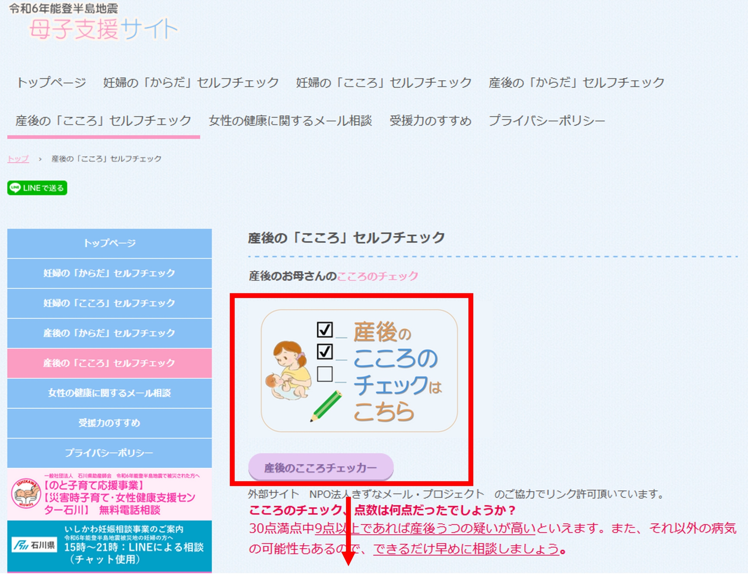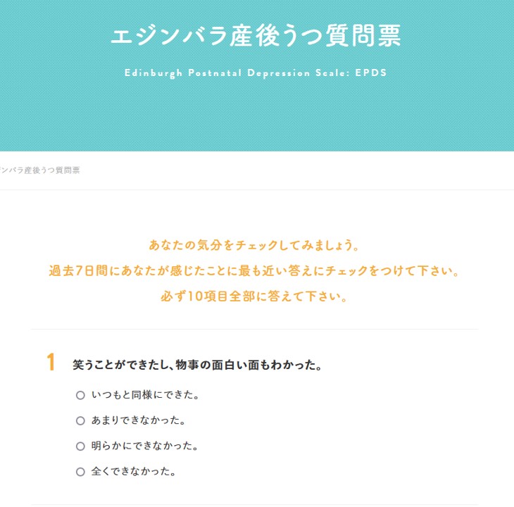 「母子支援サイト」では、微力ながら、きずなメール内の「エジンバラ産後うつ質問票」をご活用いただいています。産前産後のセフルチェックにお役立てください。