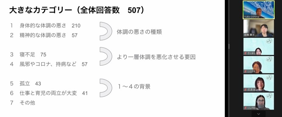 「今、あなた自身の体調はいかがですか?」と尋ねたアンケートに対して、「あまりよくない」「よくない」と答えた方の自由記述をカテゴリーに分析したところ、以下のようなカテゴリーとなりました(自由記述の全体回答数は507)。
