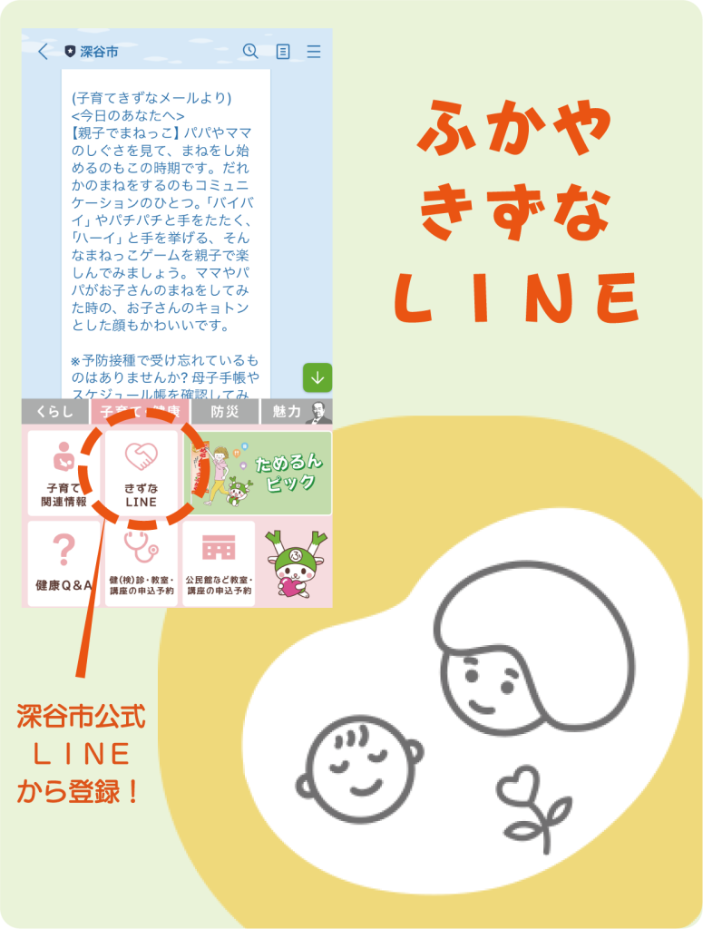 「ふかやきずなLINE」(深谷市のきずなメールの名称)を運営するこども青少年課では、深谷市公式LINEアカウントを友だちになっている市民のうち、子育て情報の受け取りを希望している方へ向けて、課が独自に作った下記の画像を配信しました。
