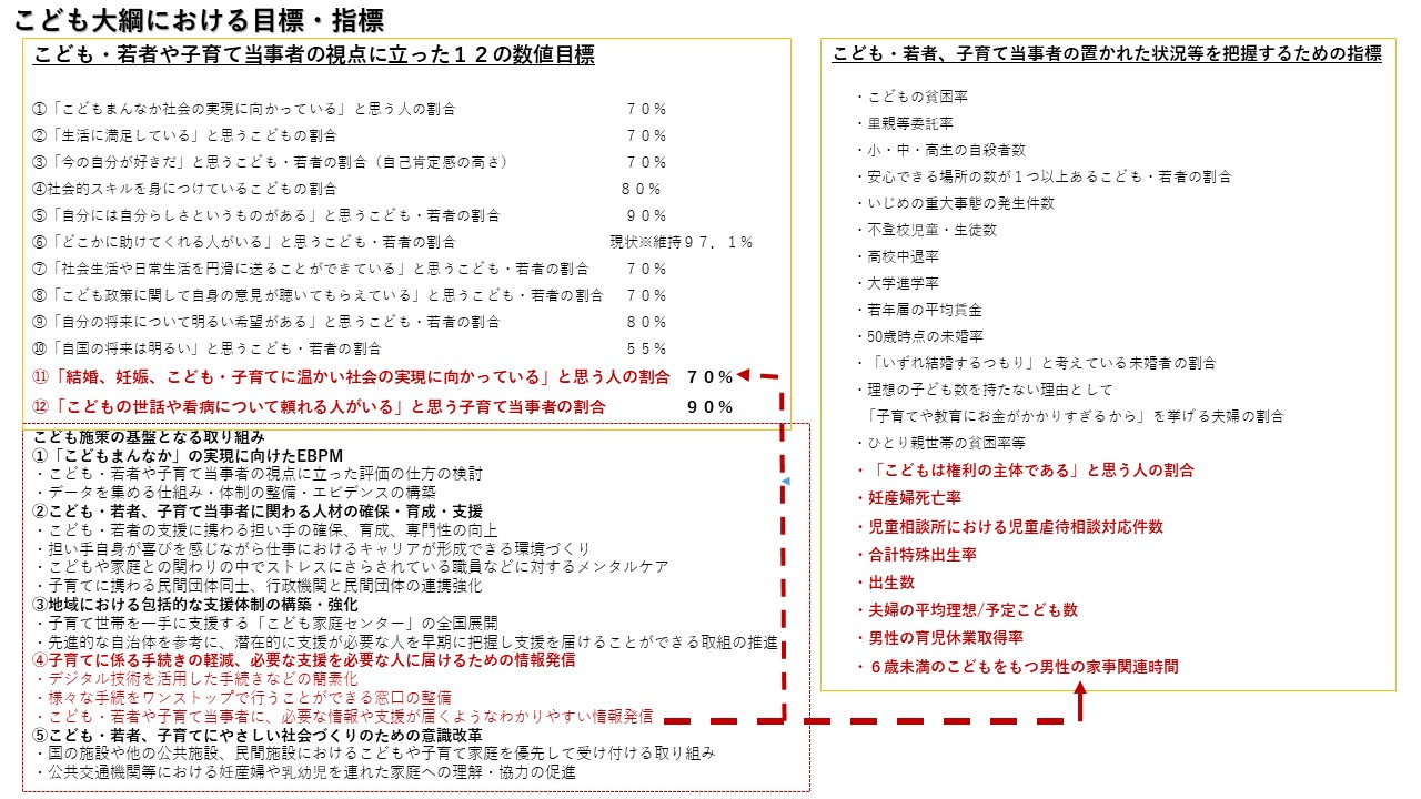 次に、こども大綱を具体的なアクションにしていくための、「こども・若者や子育て当事者の視点に立った12の数値目標」も確認。