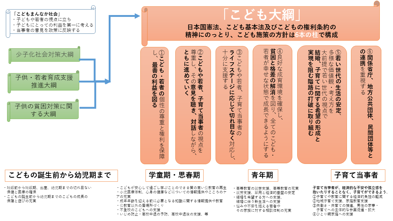 「こども大綱」とは、こどもが生きやすい社会を実現させるための政策を考える上で大元となる方針を定めたものです。6つの柱で構成された基本方針や各ライフステージで設定された重要事項も確認しました。