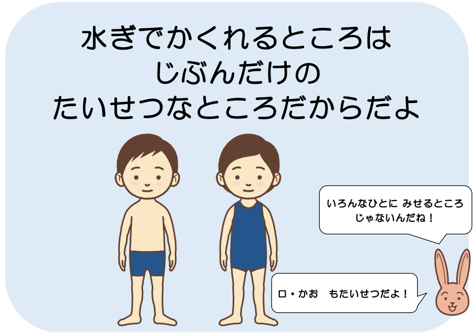 *幼児期:じぶんだけのたいせつなところをさわられていやなきもちになったら、「いやだ!」といおう。にげよう。あんしんできるおとなにおはなししよう。もしさわられても、けっしてあなたはわるくない。