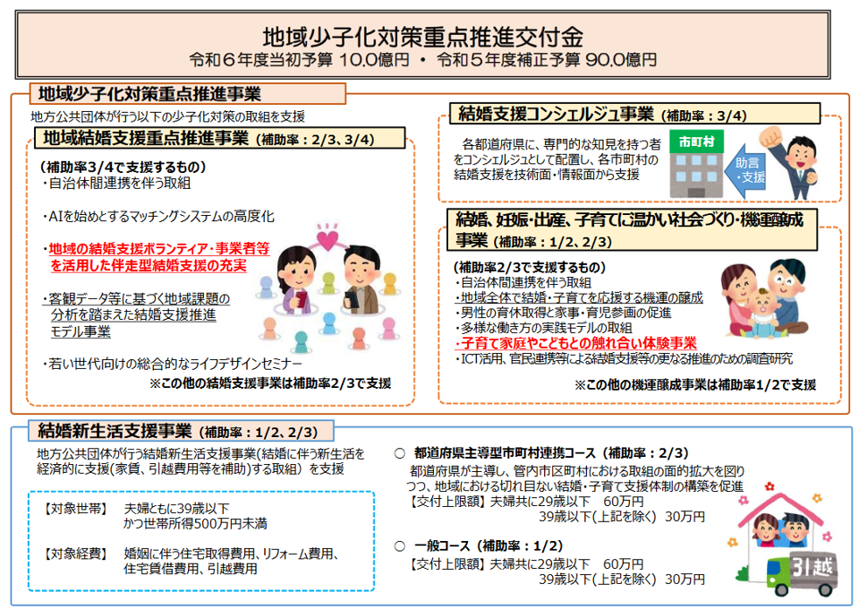 地域少子化対策重点推進交付金により、地方公共団体が行う「結婚に対する取組」及び「結婚、妊娠・出産、子育てに温かい社会づくり・機運の醸成の取組」を支援するとともに、結婚に伴う新生活を経済的に支援するための「結婚新生活支援事業」(新婚世帯を対象に家賃、引越費用等を補助)を支援しています。 (こども家庭庁HP 地域少子化対策重点推進交付金ページより抜粋)