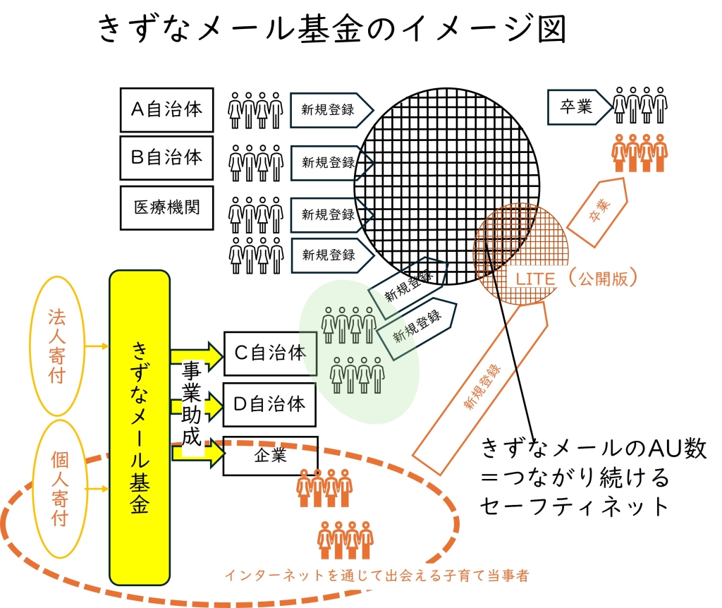 NPO法人きずなメール・プロジェクトは、きずなメール事業を「テキストメッセージでつながりつづけるセーフティネット」と位置づけ、セーフティネットをさらに広げ、子ども虐待を減らすための「きずなメール基金」を設立しました。