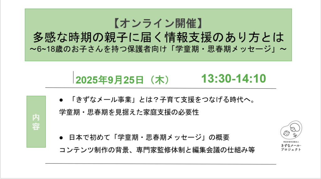 【オンライン開催】多感な時期の親子に届く情報支援のあり方とは~6~18歳のお子さんを持つ保護者向け「学童期・思春期メッセージ」~