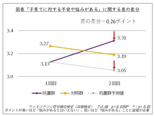 対照群・処置群における1回目と2回目の差の差分析(DID分析)により、きずなメール事業の読者である処置群は、対照群に比べて「子育てに対する不安や悩み」が軽減されることが明らかとなった。