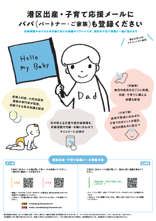 簡単に言うと、きずなメールと自治体と一緒に「母親だけでなく、父親に向けても子育て支援を強化しようよ!」というものです。周知チラシやおめでとうカードを父親向けに作成し、周知することでそれを目指します。港区でもさっそくその取り組みを開始しましたので、周知物と効果測定について、ご紹介します。