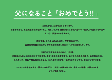 簡単に言うと、きずなメールと自治体と一緒に「母親だけでなく、父親に向けても子育て支援を強化しようよ!」というものです。周知チラシやおめでとうカードを父親向けに作成し、周知することでそれを目指します。港区でもさっそくその取り組みを開始しましたので、周知物と効果測定について、ご紹介します。