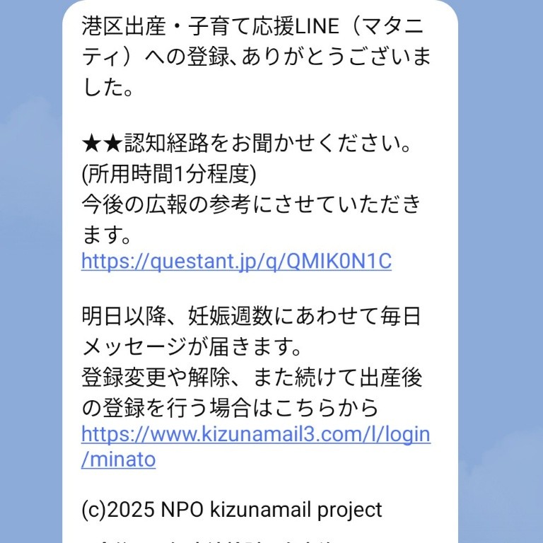 「港区出産・子育て応援LINE」(きずなメール)登録時のサンキューメッセージ内に、認知経路と属性をおたずねするURLリンクを掲載します。