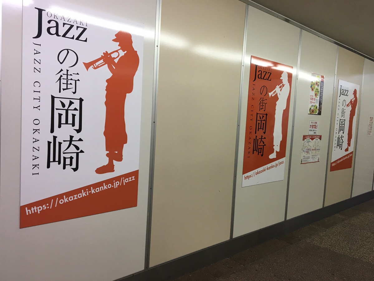 駅前の地下道を下りると、「Jazz City Okazaki」のポスターが並びます。