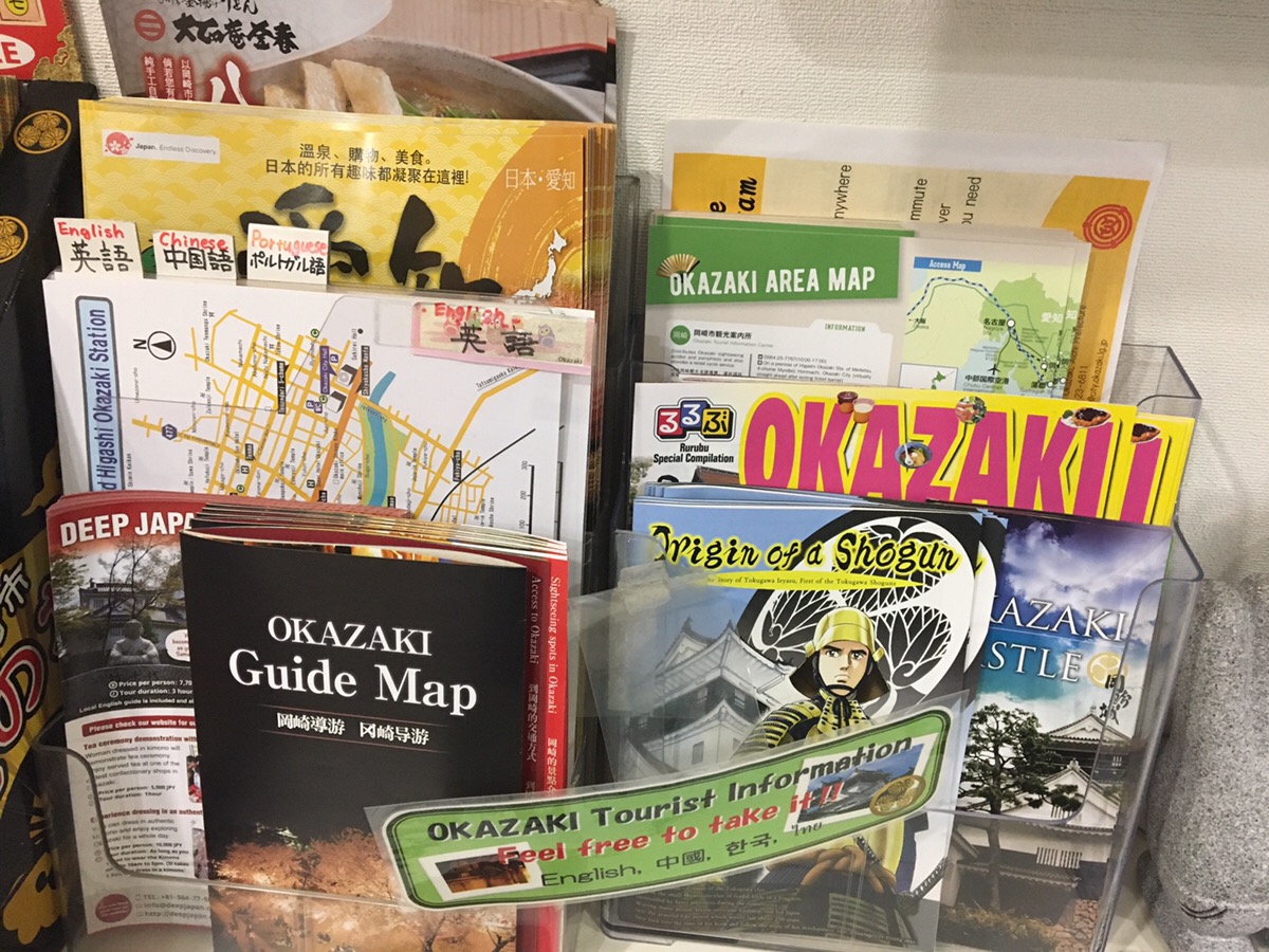 東岡崎駅前には、多言語の観光用資料がもりもり。