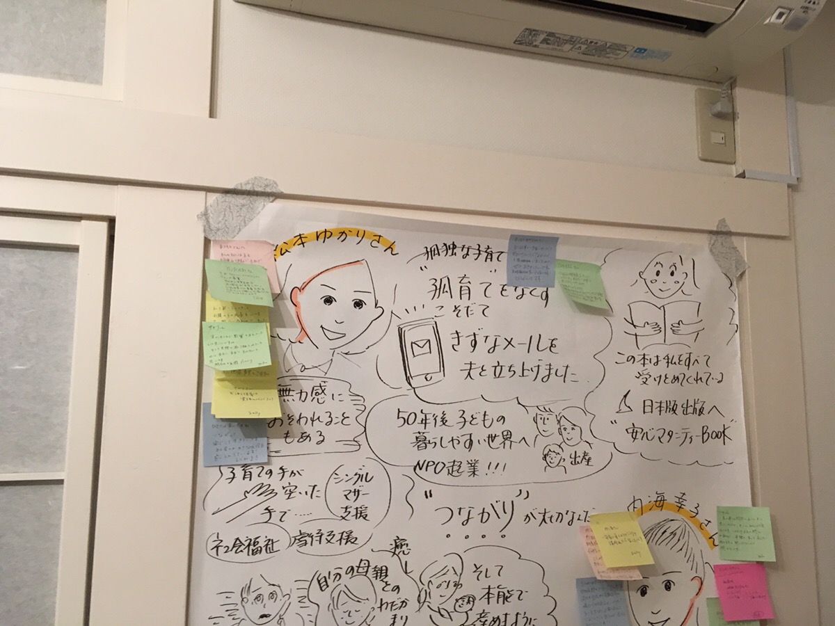 ▲こちらは第2部の「お産で繋がろう・活動と想いのシェア」でのグラレコ。藤田ハルノさんが描いてくださいました。